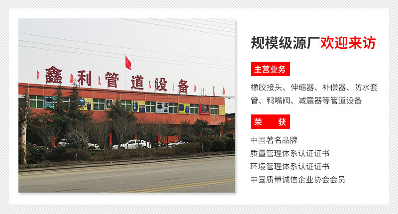 鑫利管道設(shè)備有限公司是生產(chǎn)各種橡膠接頭的生產(chǎn)廠家,。主要產(chǎn)品有橡膠管接頭、橡膠軟接頭、可曲撓橡膠接頭、單球體橡膠接頭、雙球體橡膠接頭、異徑橡膠接頭、卡箍橡膠接頭、絲扣橡膠接頭、90度橡膠接頭、異徑橡膠接頭、多球體橡膠接頭等。嚴(yán)格按照標(biāo)準(zhǔn)設(shè)計生產(chǎn),特殊規(guī)格型號可按用戶需要和要求訂做。設(shè)計獨特,結(jié)構(gòu)新穎合理,性能可靠,給工程施工、維修帶來極大的方便和效益。