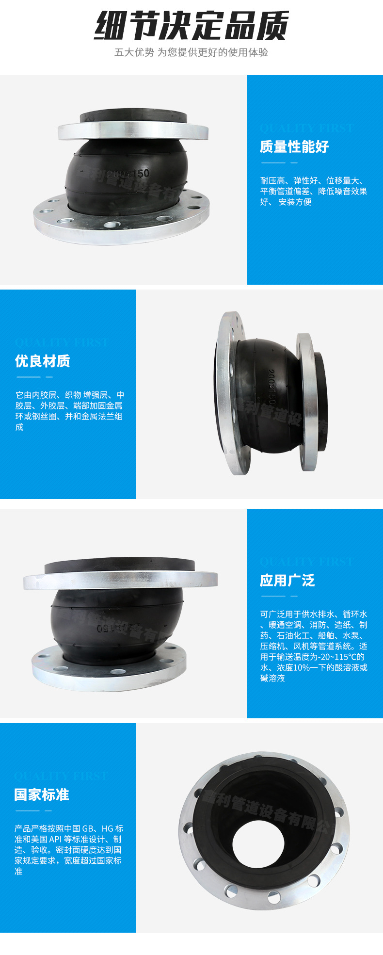 鑫利管道設(shè)備有限公司是生產(chǎn)各種橡膠接頭的生產(chǎn)廠家,。主要產(chǎn)品有橡膠管接頭、橡膠軟接頭、可曲撓橡膠接頭、單球體橡膠接頭、雙球體橡膠接頭、異徑橡膠接頭、卡箍橡膠接頭、絲扣橡膠接頭、90度橡膠接頭、異徑橡膠接頭、多球體橡膠接頭等。嚴(yán)格按照標(biāo)準(zhǔn)設(shè)計(jì)生產(chǎn),特殊規(guī)格型號(hào)可按用戶需要和要求訂做。設(shè)計(jì)獨(dú)特,結(jié)構(gòu)新穎合理,性能可靠,給工程施工、維修帶來(lái)極大的方便和效益。 我公司技術(shù)力量雄厚,設(shè)備精良,工藝好,有一批從事多年機(jī)械設(shè)計(jì)制造經(jīng)驗(yàn)豐富的高級(jí)工程技術(shù)人員和專業(yè)技術(shù)工人。生產(chǎn)的產(chǎn)品廣泛用于供水、排水、電力、冶金、城建、石油、化工環(huán)保各大中型企業(yè)等領(lǐng)域的供排水事業(yè)的建設(shè)中,“鑫利人”竭誠(chéng)歡迎各界朋友、新老用戶前來(lái)我們公司實(shí)地考察指導(dǎo)、精誠(chéng)合作、共同發(fā)展、同創(chuàng)大業(yè)。熱線:
